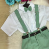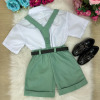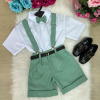 Este conjunto social infantil é a escolha perfeita para deixar os pequenos elegantes e confortáveis em eventos como casamentos, batizados, aniversários, formaturas e cerimônias em geral. Com um visual sofisticado, ele é ideal para quem busca estilo com praticidade. Detalhes do Produto: Camisa social branca de manga curta, confeccionada em microfibra 100% poliéster, com toque macio e caimento leve. Short verde em linho 70% poliéster/16% viscose/11% linho/3% algodão, com acabamento moderno na barra dobrada. Acompanha gravata borboleta verde, suspensório verde com regulagem e cinto ajustável preto com fivela metálica. Itens Inclusos:CamisaShortGravata borboletaSuspensórioCinto Calçado não incluso – vendido separadamente. Disponivel em nosso site na categoria calçados meninosAs tonalidades das peças podem variar de acordo com as configurações de tela do seu dispositivo.Para garantir o ajuste ideal, consulte sempre a nossa tabela de medidas antes de finalizar a compra. As medidas podem apresentar pequenas variações conforme o lote de fabricação.