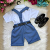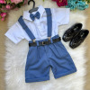 Este conjunto social infantil é a escolha perfeita para deixar os pequenos elegantes e confortáveis em eventos como casamentos, batizados, aniversários, formaturas e cerimônias em geral. Com um visual sofisticado, ele é ideal para quem busca estilo com praticidade. Detalhes do Produto: Camisa social branca de manga curta, confeccionada em microfibra 100% poliéster, com toque macio e caimento leve. Short preto em twill 100% poliéster, com acabamento moderno na barra dobrada. Acompanha gravata borboleta Azul, suspensório azul com regulagem e cinto ajustável preto com fivela metálica. Itens Inclusos:CamisaShortGravata borboletaSuspensórioCinto Calçado não incluso – vendido separadamente. Disponivel em nosso site na categoria calçados meninosAs tonalidades das peças podem variar de acordo com as configurações de tela do seu dispositivo.Para garantir o ajuste ideal, consulte sempre a nossa tabela de medidas antes de finalizar a compra. As medidas podem apresentar pequenas variações conforme o lote de fabricação.