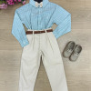 Conjunto Social Henrique – Elegância Clássica Um conjunto sofisticado e moderno, perfeito para ocasiões especiais. A combinação da camisa com a calça social cria um visual elegante, ideal para deixar os pequenos ainda mais estilosos em eventos importantes. Perfeito para casamentos, aniversários, batizados, formaturas e ensaios fotográficos. Detalhes do Conjunto • Camisa social verde de manga longa • Estampa listrada delicada, trazendo um visual clássico e sofisticado • Gola social estruturada • Fechamento frontal por botões • Punhos com botões, permitindo melhor ajuste nas mangas • Tecido leve e confortável • Calça social bege • Modelagem elegante com pregas frontais • Corte moderno que garante bom caimento • Cintura com passantes para uso de cinto • Cinto marrom • Acessório clássico que complementa o visual • Gravata borboleta bege •Detalhe sofisticado que completa o look social Destaques do Look • Visual clássico e elegante • Combinação de cores sofisticadas e versáteis • Ideal para eventos especiais e fotos marcantes Informações Importantes • Calçados não acompanha o produto • Tecido camisa 100% algodão/ calça oxford 100% poliester • Acessórios das fotos são ilustrativos • As cores podem variar conforme a tela do dispositivo • As medidas podem variar em até 2cm