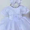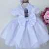 Confeccionado em tecido misto possui forro em poliéster e algodão para não incomodar a criança e proporcionando um caimento incrível e sofisticado, possui gola redonda, comprimento médio, mangas curtas, possui elástico nas costas para melhor ajuste, acabamento com lindo laço na parte posterior do vestido completa o look dos sonhos!   * Medidas podem variar em até 4cm * Caso queira o vestido mais armado, recomendamos o uso do saiote ou anágua de armação, disponível no nosso site na categoria acessórios. * Tiara vendida separadamente, disponível em nosso site na categoria acessórios.* Otima Opção para Batizados e Daminhas.