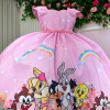 TECIDO DO SAIOTE 100% POLIÉSTER TECIDO BABADON 100% POLIAMIDA LOONEY TUNES, BABY, COELHINHO, PATINHO , PIU PIU. ESTE MODELO ACOMPANHA LACINHO Confeccionado em tecido misto possui forro em poliéster e algodão para não incomodar a criança e proporcionando um caimento incrível e sofisticado, possui gola redonda, comprimento médio, mangas curtas, contém, também, elástico nas costas para melhor ajuste, acabamento com lindo laço na parte posterior do vestido completa o look dos sonhos! * Medidas podem variar em até 4cm. * Caso queira o vestido mais armado, recomendamos o uso do saiote ou anágua de armação, disponível no nosso site na categoria acessórios. * Tiara vendida separadamente, disponível em nosso site na categoria acessórios. * Calçados vendido separadamente, disponível em nosso site na categoria calçados. * LEMBRANDO QUE PODERA HAVER VARIAÇÃO DE TONALIDADE DO PRODUTO DEPENDENDO DA TELA DO SEU DISPOSITIVO